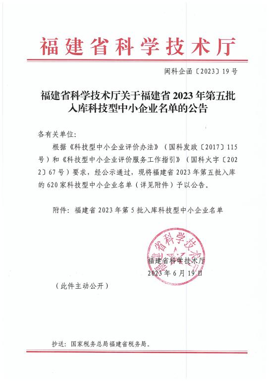 福建省2023年第5批入庫(kù)科技型中小企業(yè)名單公告正文.jpg PICTURE
