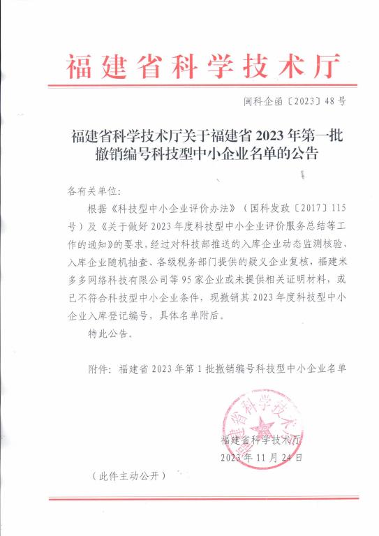 福建省2023年第1批撤銷編號(hào)科技型中小企業(yè)名單公告