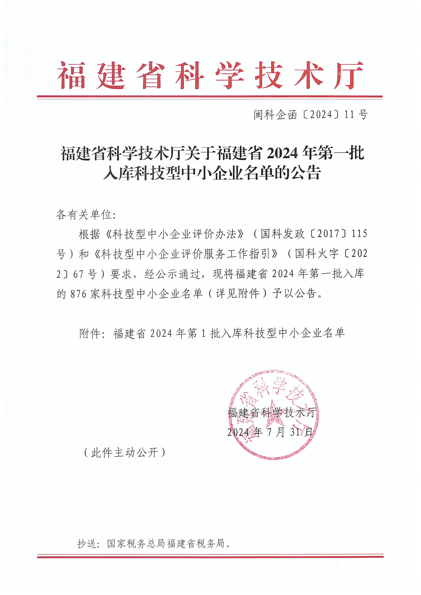 福建省2024年第1批入庫科技型中小企業(yè)名單公告