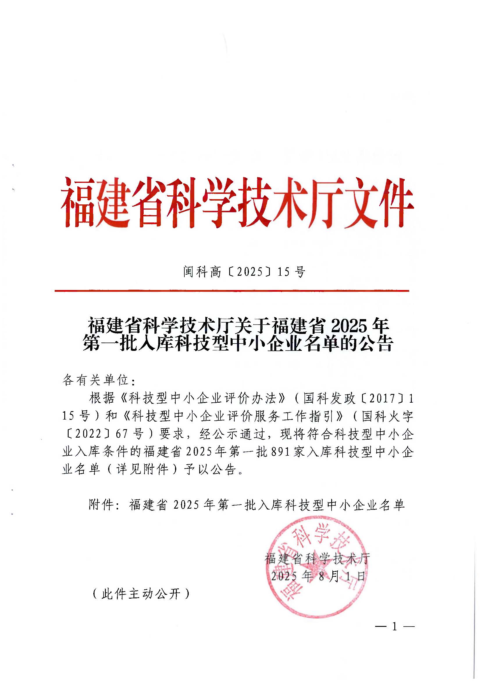 福建省2025年第1批入庫科技型中小企業(yè)名單公告