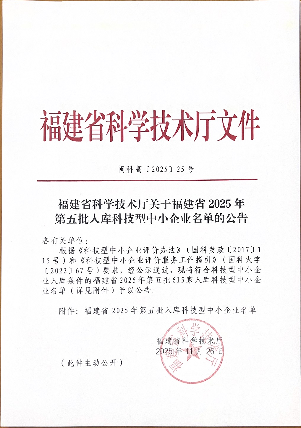 福建省2025年第5批入庫(kù)科技型中小企業(yè)名單公告正文.jpg PICTURE