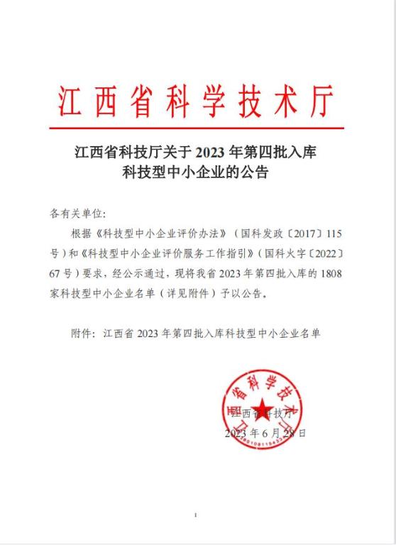 江西省2023年第4批入庫科技型中小企業(yè)名單公告
