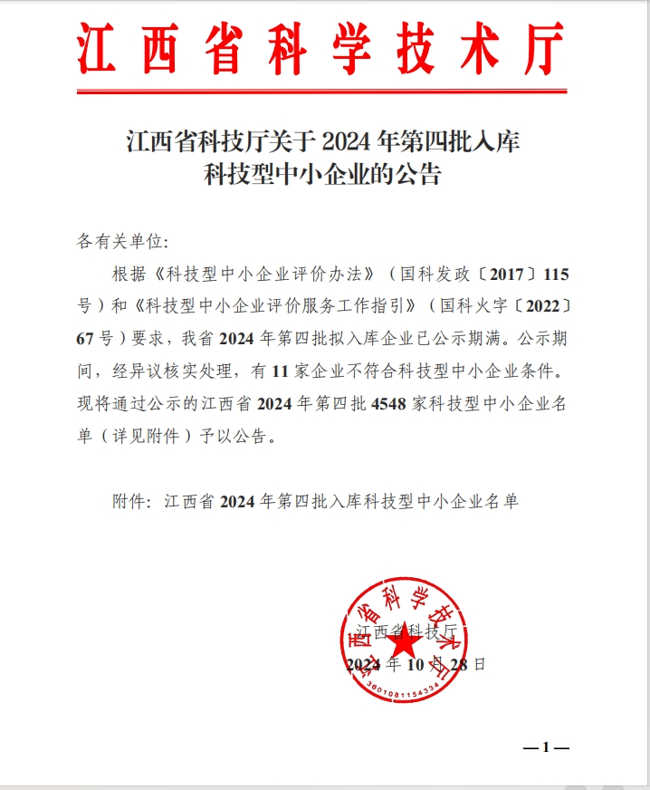 江西省2024年第4批入庫科技型中小企業(yè)名單公告