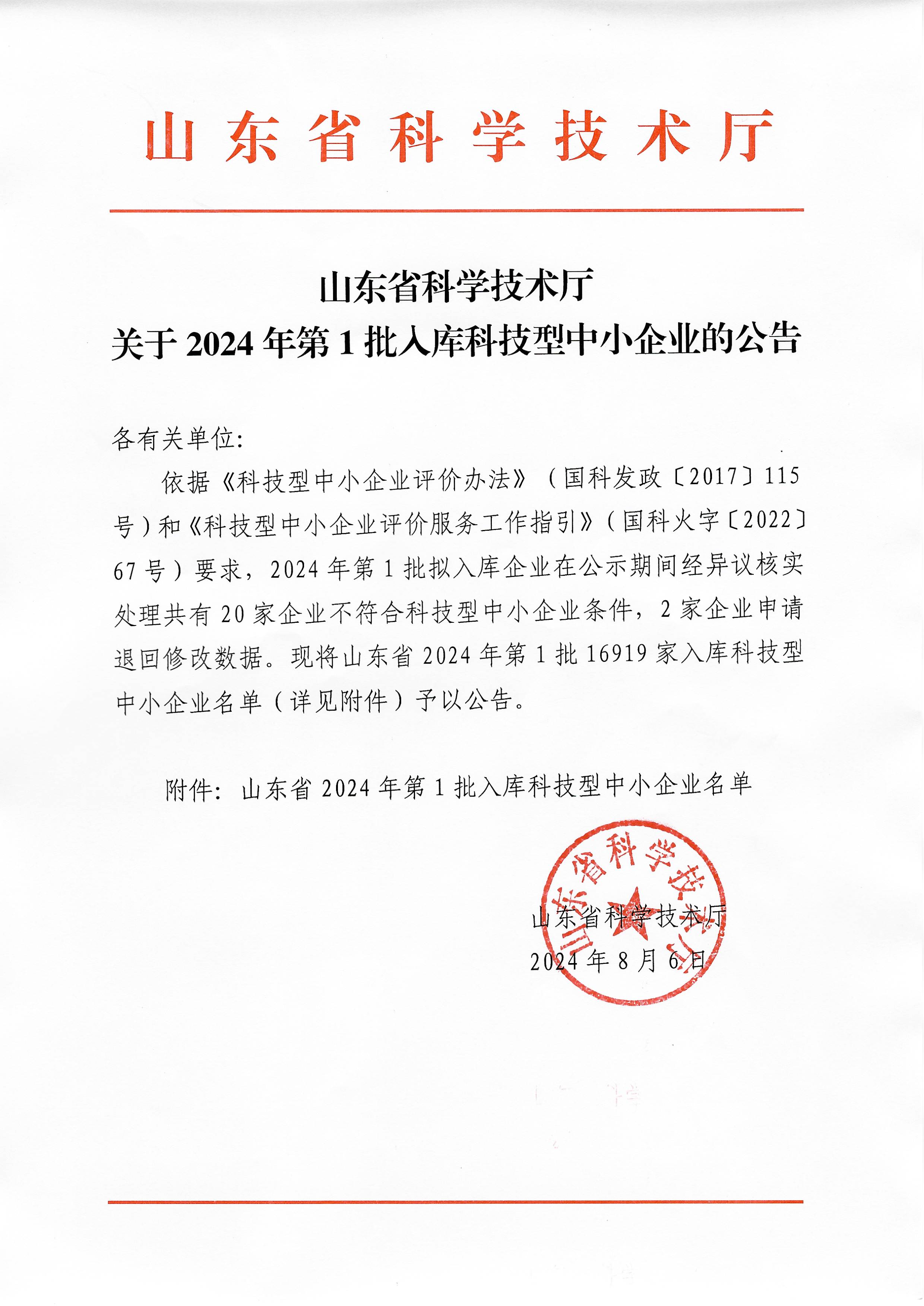 山東省2024年第1批入庫科技型中小企業(yè)名單公告