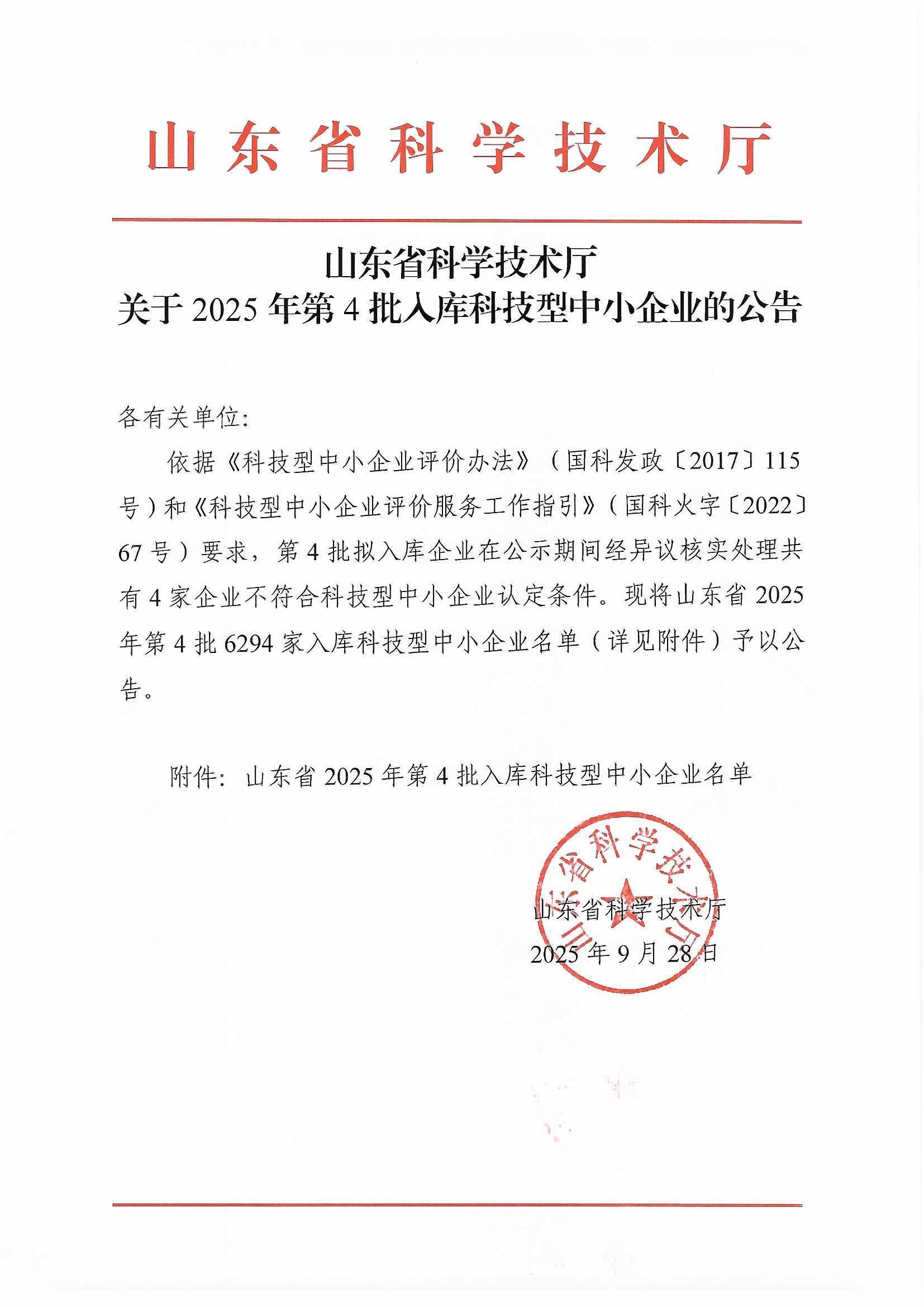 山東省2025年第4批入庫(kù)科技型中小企業(yè)名單公告正文.jpg PICTURE