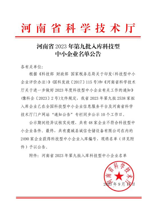 河南省2023年第9批入庫(kù)科技型中小企業(yè)名單公告正文.jpg PICTURE