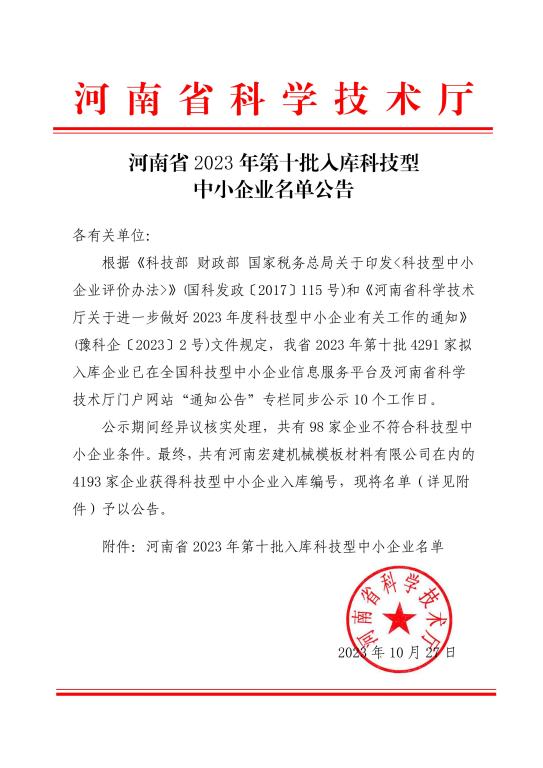 河南省2023年第10批入庫科技型中小企業(yè)名單公告