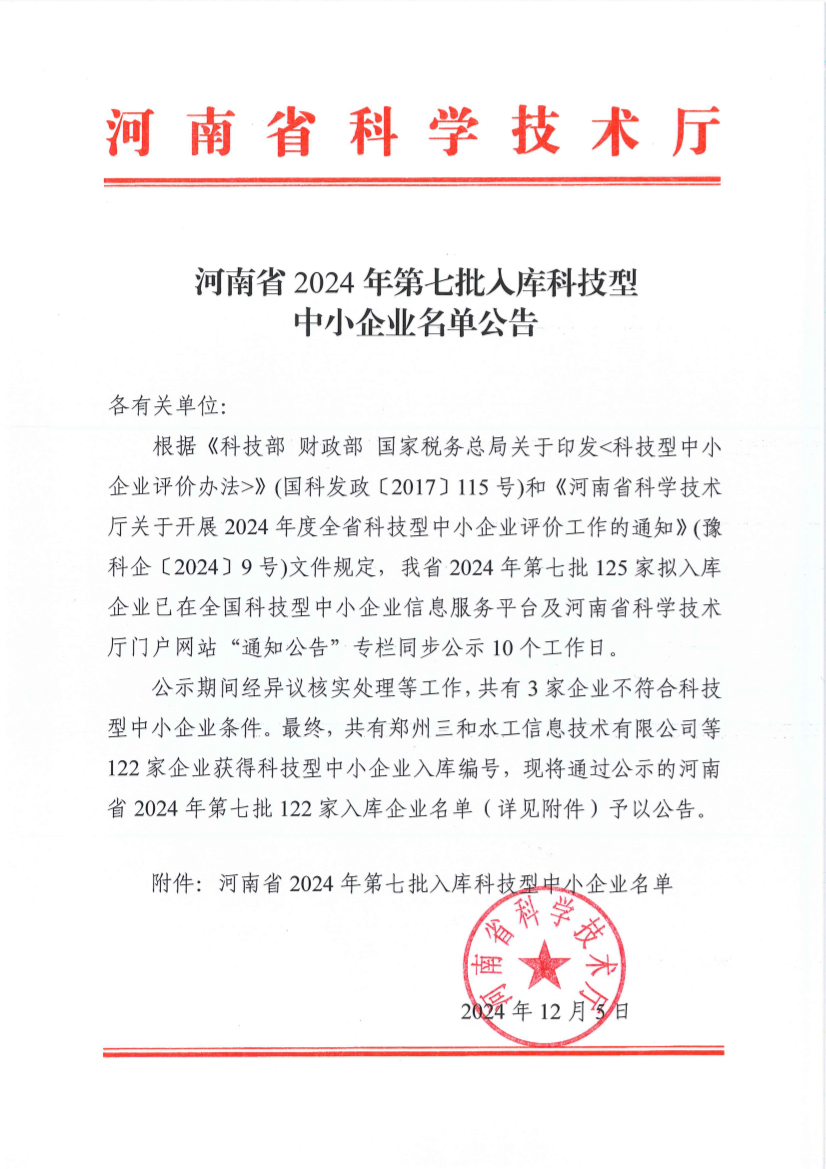 河南省2024年第7批入庫科技型中小企業(yè)名單公告