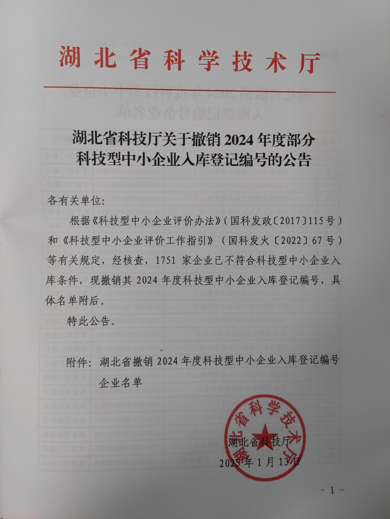 湖北省2025年第1批撤銷編號科技型中小企業(yè)名單公告