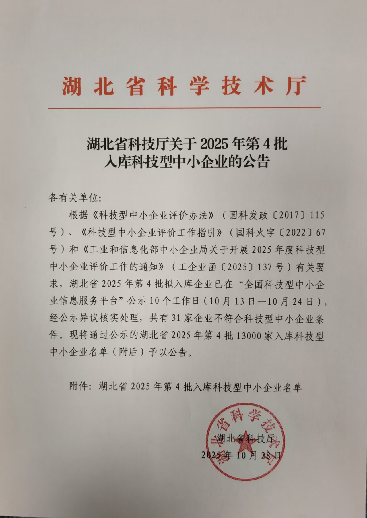 湖北省2025年第4批入庫(kù)科技型中小企業(yè)名單公告正文.jpg PICTURE