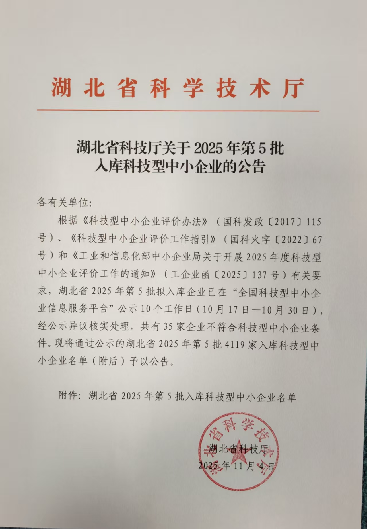 湖北省2025年第5批入庫科技型中小企業(yè)名單公告