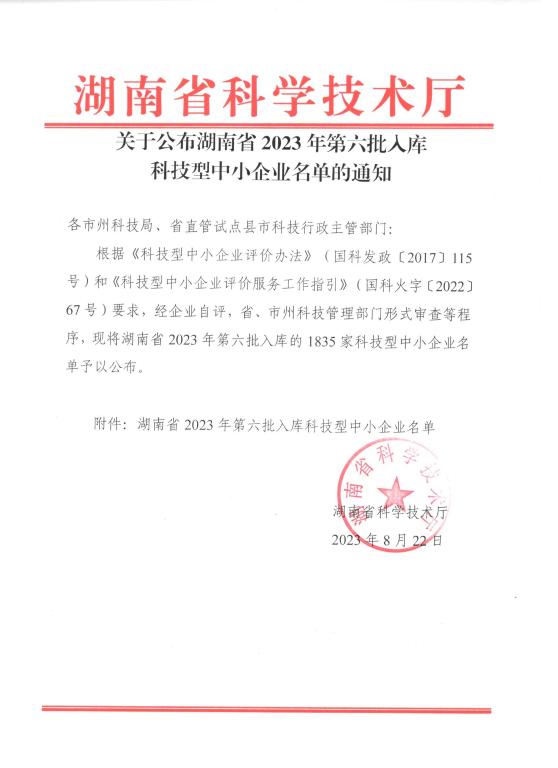 湖南省2023年第6批入庫(kù)科技型中小企業(yè)名單公告正文.jpg PICTURE