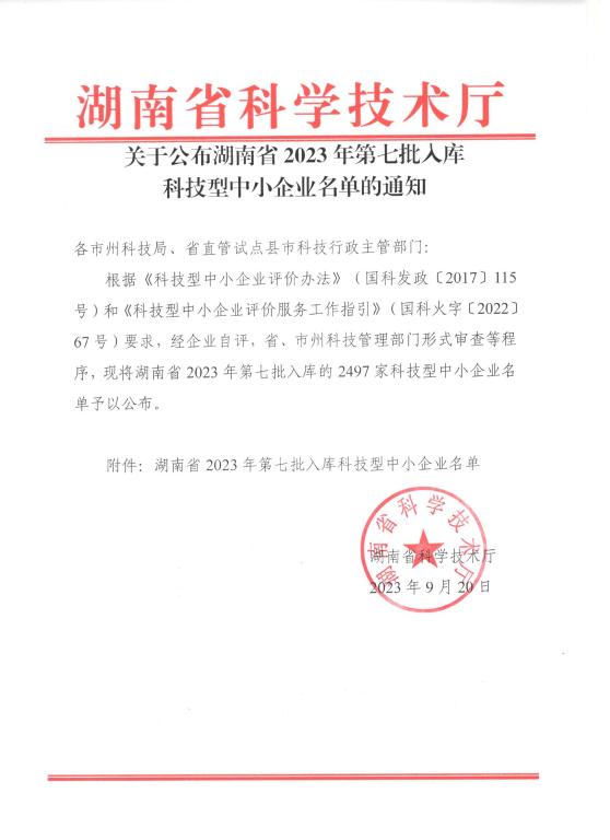 湖南省2023年第7批入庫科技型中小企業(yè)名單公告