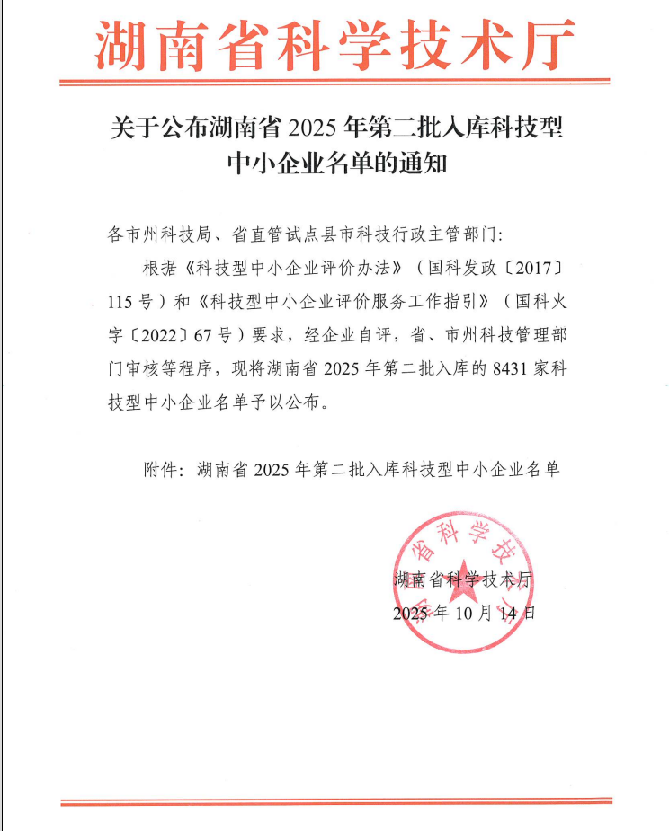 湖南省2025年第2批入庫科技型中小企業(yè)名單公告