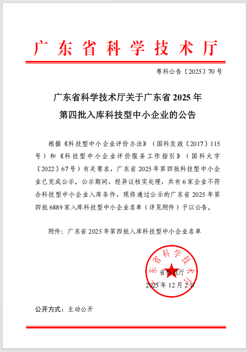 廣東省2025年第4批入庫科技型中小企業(yè)名單公告