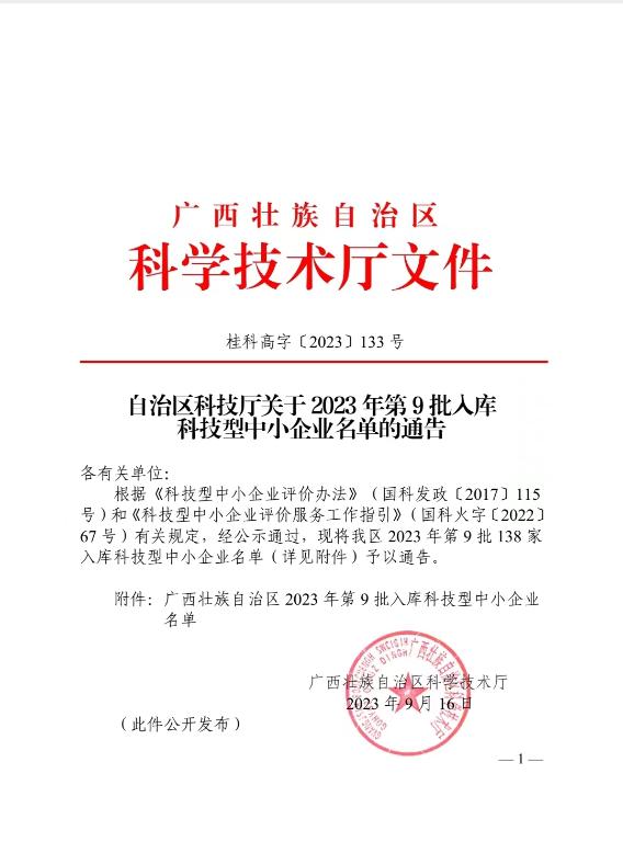 廣西壯族自治區(qū)2023年第9批入庫科技型中小企業(yè)名單公告