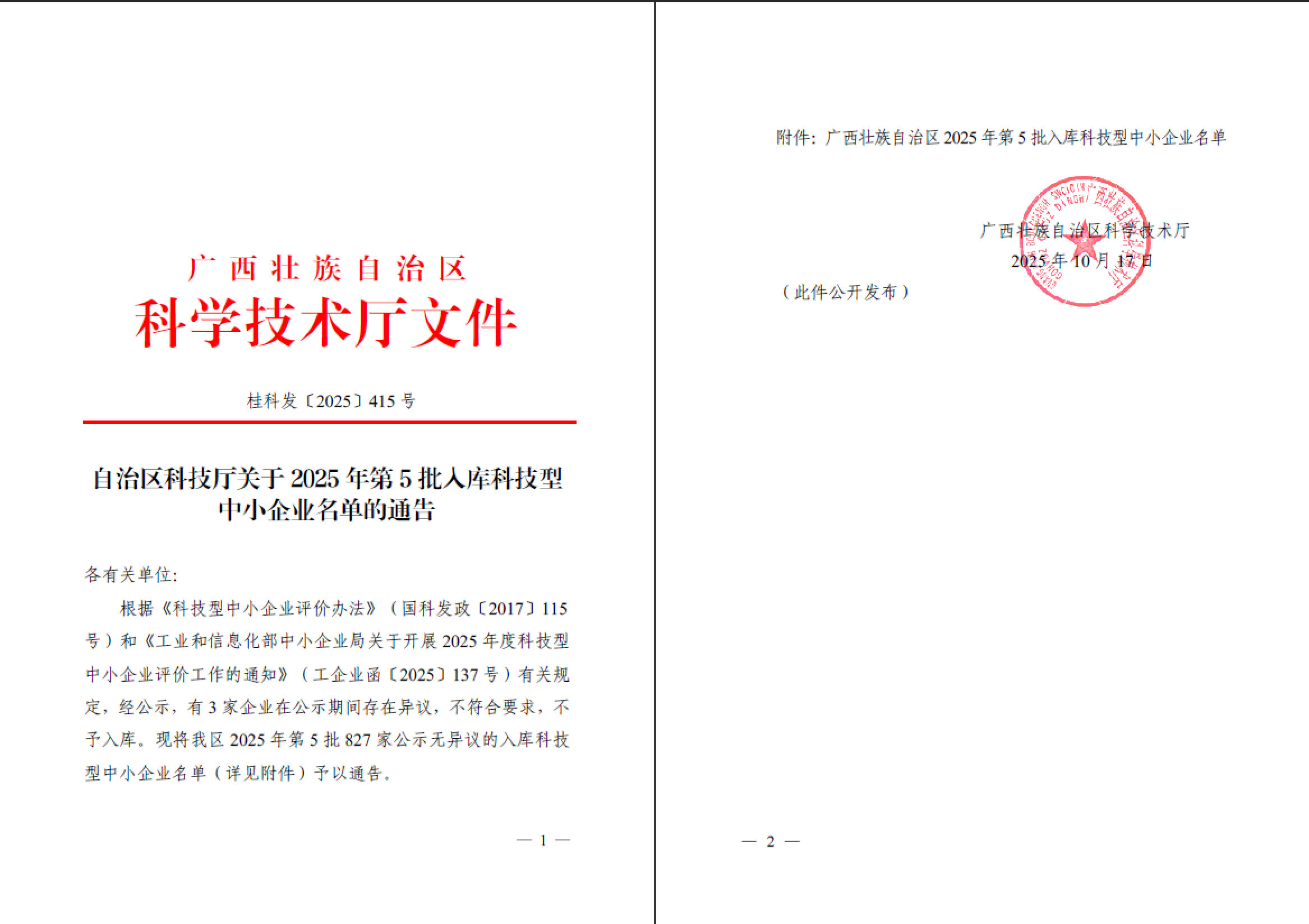 廣西壯族自治區(qū)2025年第5批入庫科技型中小企業(yè)名單公告