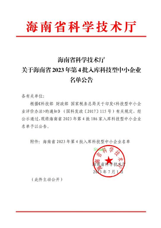 海南省科學(xué)技術(shù)廳關(guān)于海南省2023年第4批入庫(kù)科技型中小企業(yè)名單公告.jpg PICTURE