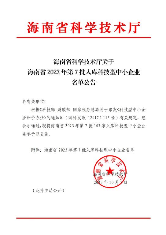 海南省2023年第7批入庫(kù)科技型中小企業(yè)名單公告正文.jpg PICTURE