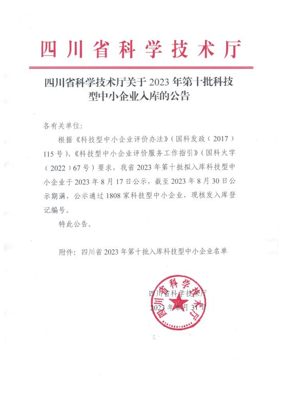 四川省2023年第10批入庫科技型中小企業(yè)名單公告