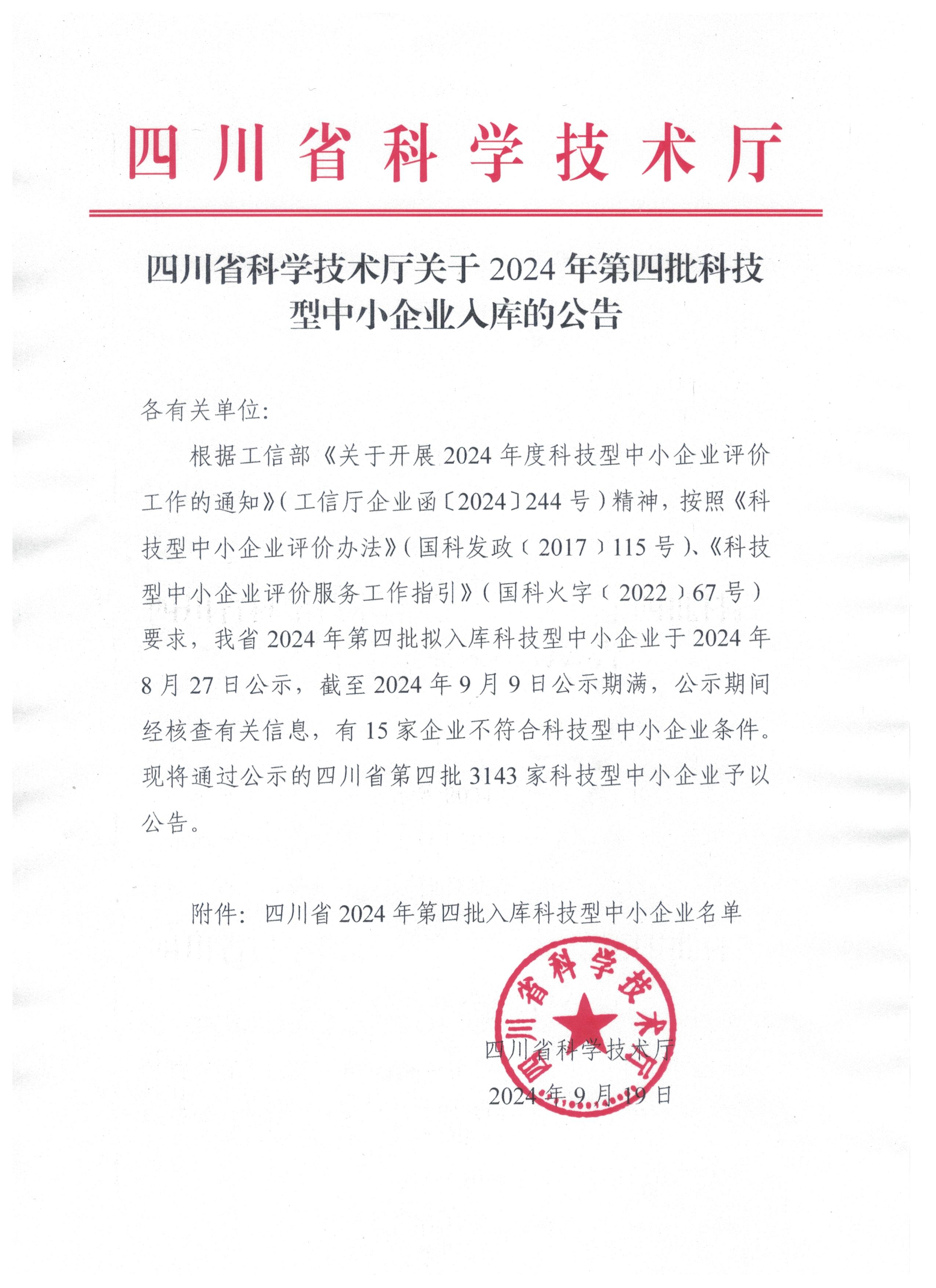 四川省2024年第4批入庫科技型中小企業(yè)名單公告