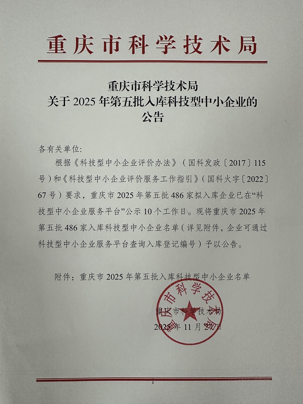 重慶市2025年第5批入庫科技型中小企業(yè)名單公告