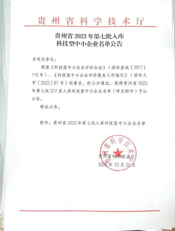 貴州省2023年第7批入庫(kù)科技型中小企業(yè)名單公告