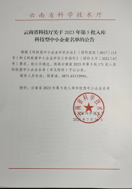云南省2023年第5批入庫科技型中小企業(yè)名單公告