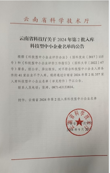 云南省2024年第2批入庫科技型中小企業(yè)名單公告