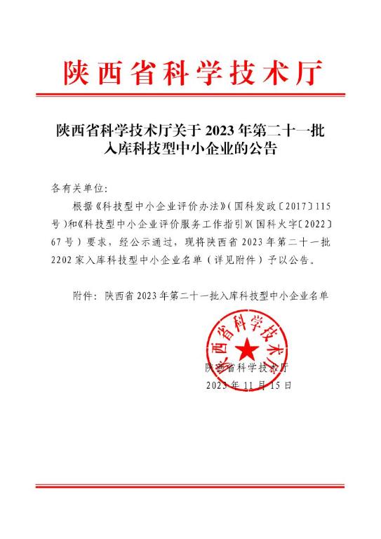 陜西省2023年第21批入庫科技型中小企業(yè)名單公告