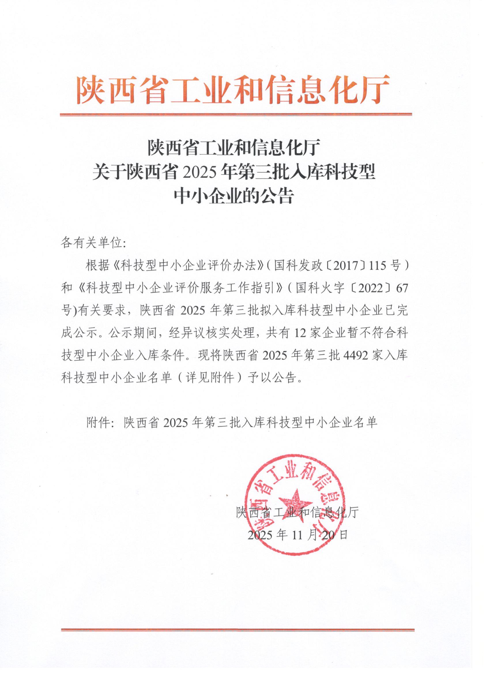 陜西省2025年第3批入庫科技型中小企業(yè)名單公告