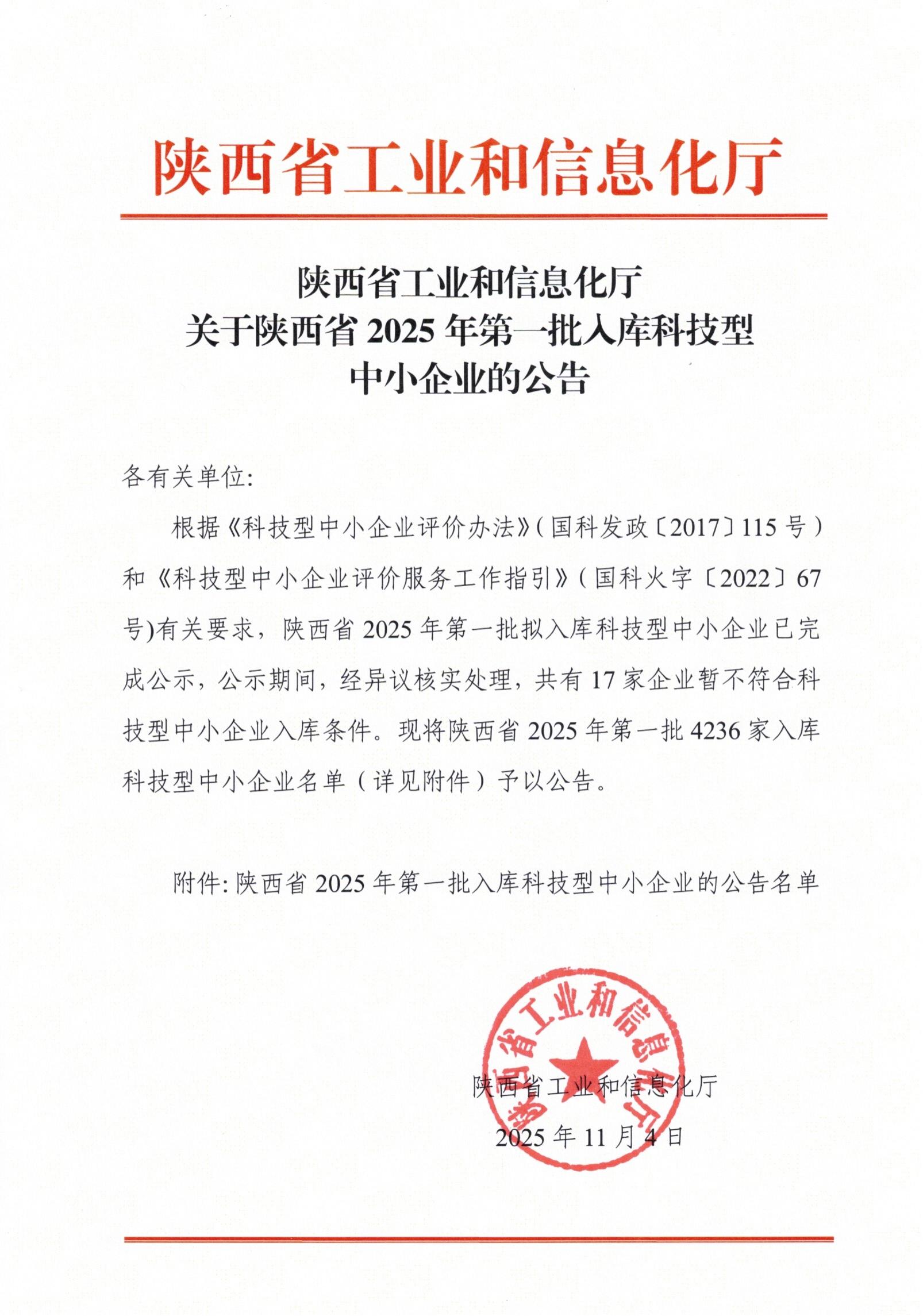 陜西省2025年第1批入庫科技型中小企業(yè)名單公告