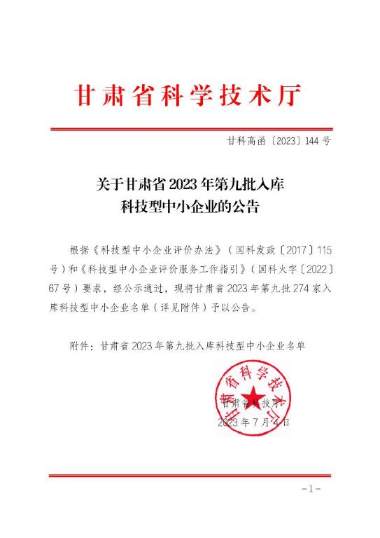 甘肅省2023年第9批入庫(kù)科技型中小企業(yè)名單公告正文.jpg PICTURE