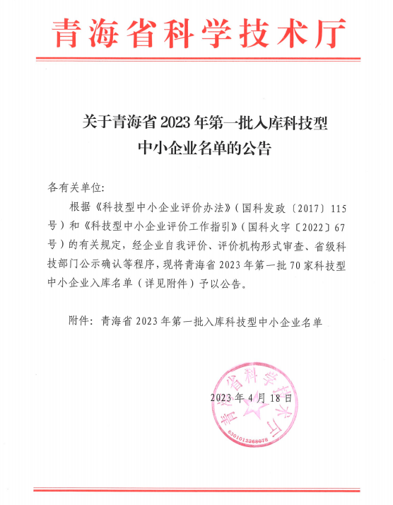 青海省2023年第1批入庫科技型中小企業(yè)名單公告