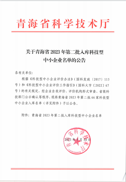 青海省2023年第2批入庫(kù)科技型中小企業(yè)名單公告正文.jpg PICTURE