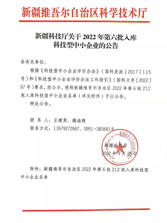 新疆維吾爾自治區(qū)2022年第6批入庫科技型中小企業(yè)名單公告