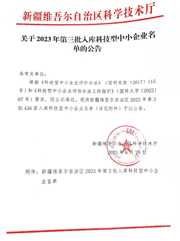 新疆維吾爾自治區(qū)2023年第3批入庫科技型中小企業(yè)名單公告