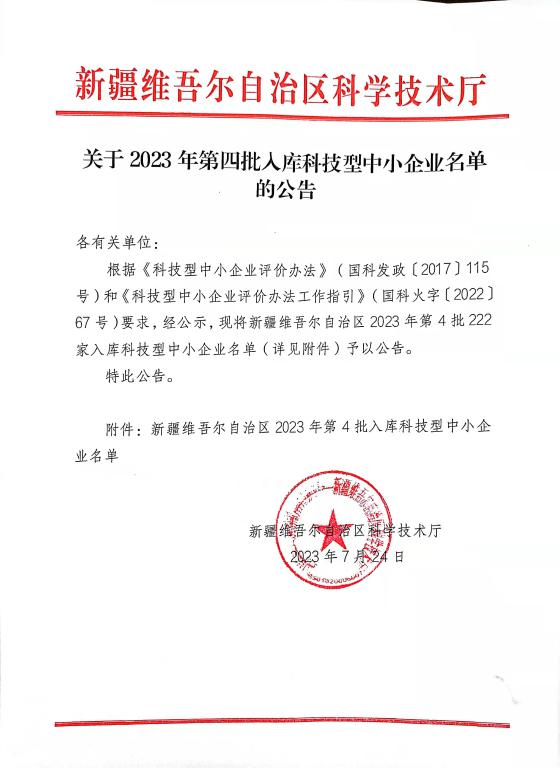 新疆維吾爾自治區(qū)2023年第4批入庫科技型中小企業(yè)名單公告