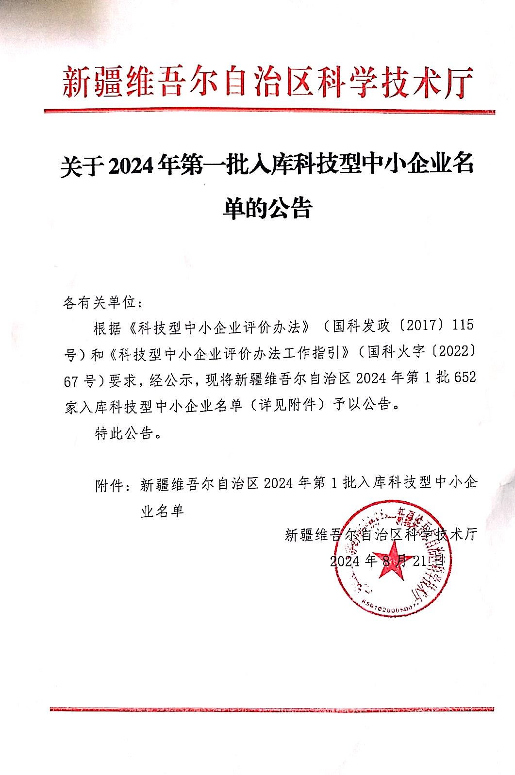 新疆維吾爾自治區(qū)2024年第1批入庫科技型中小企業(yè)名單公告