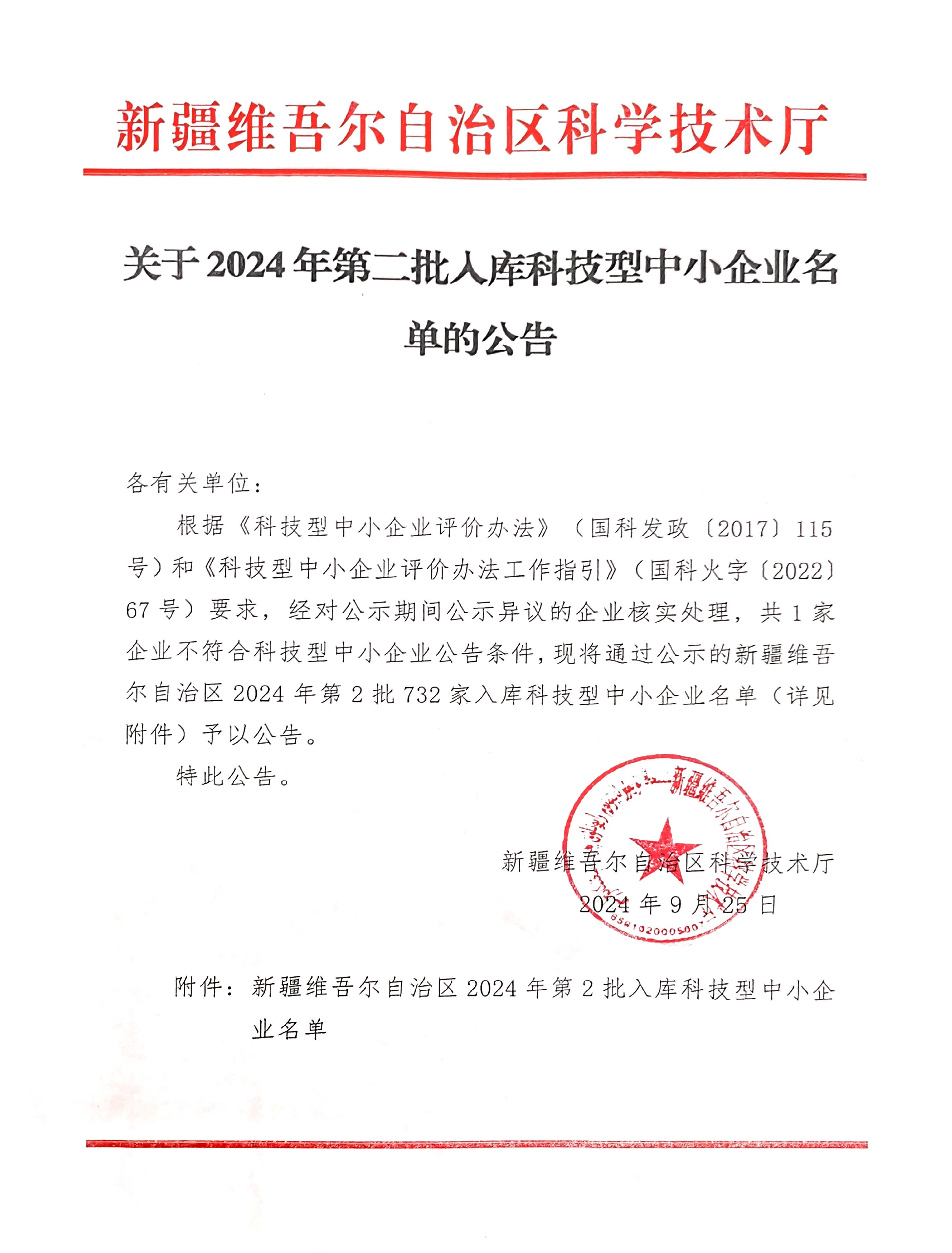 新疆維吾爾自治區(qū)2024年第2批入庫科技型中小企業(yè)名單公告