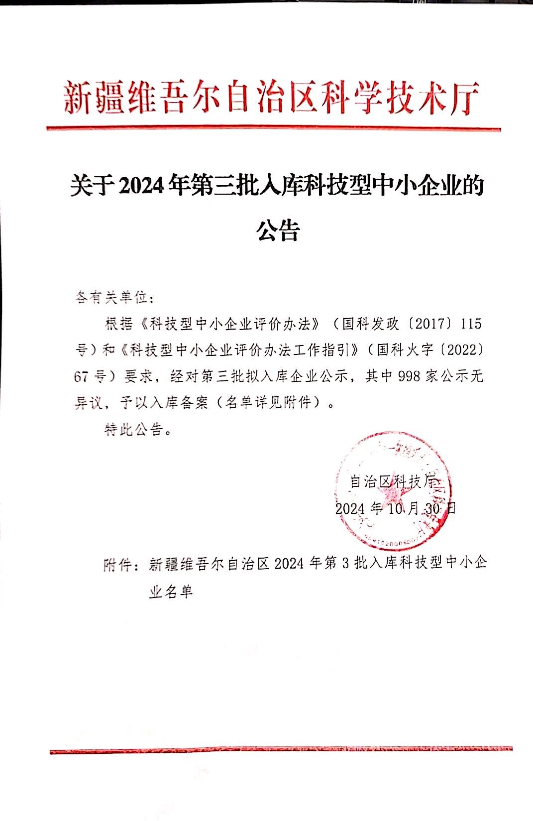 新疆維吾爾自治區(qū)2024年第3批入庫科技型中小企業(yè)名單公告