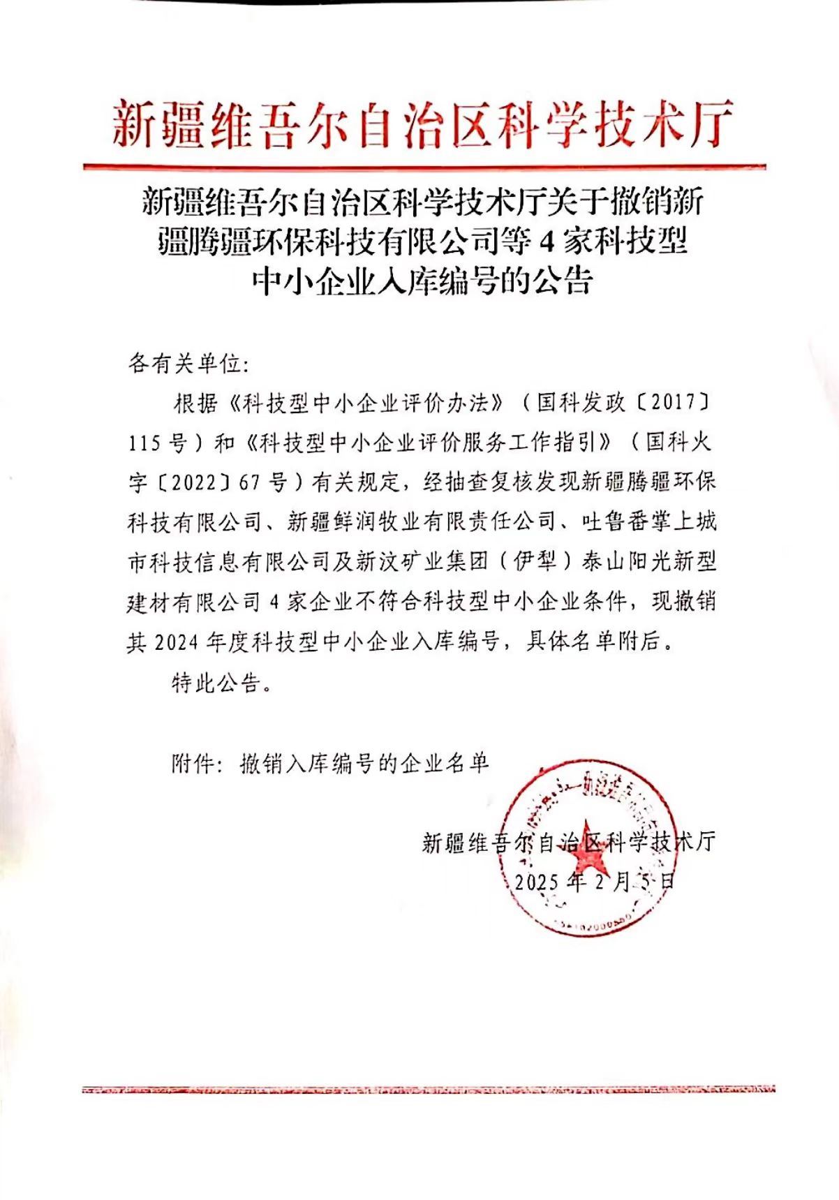 新疆維吾爾族自治區(qū)2025年第1批撤銷編號科技型中小企業(yè)名單公告