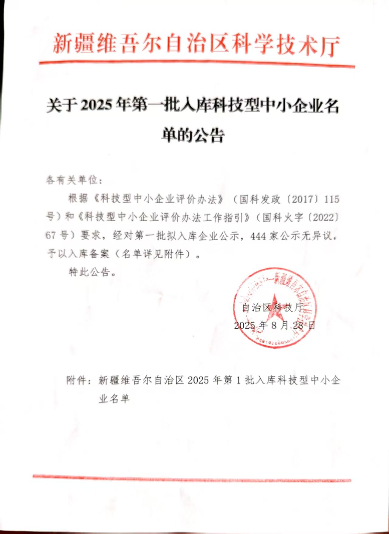 新疆維吾爾自治區(qū)2025年第1批入庫科技型中小企業(yè)名單公告