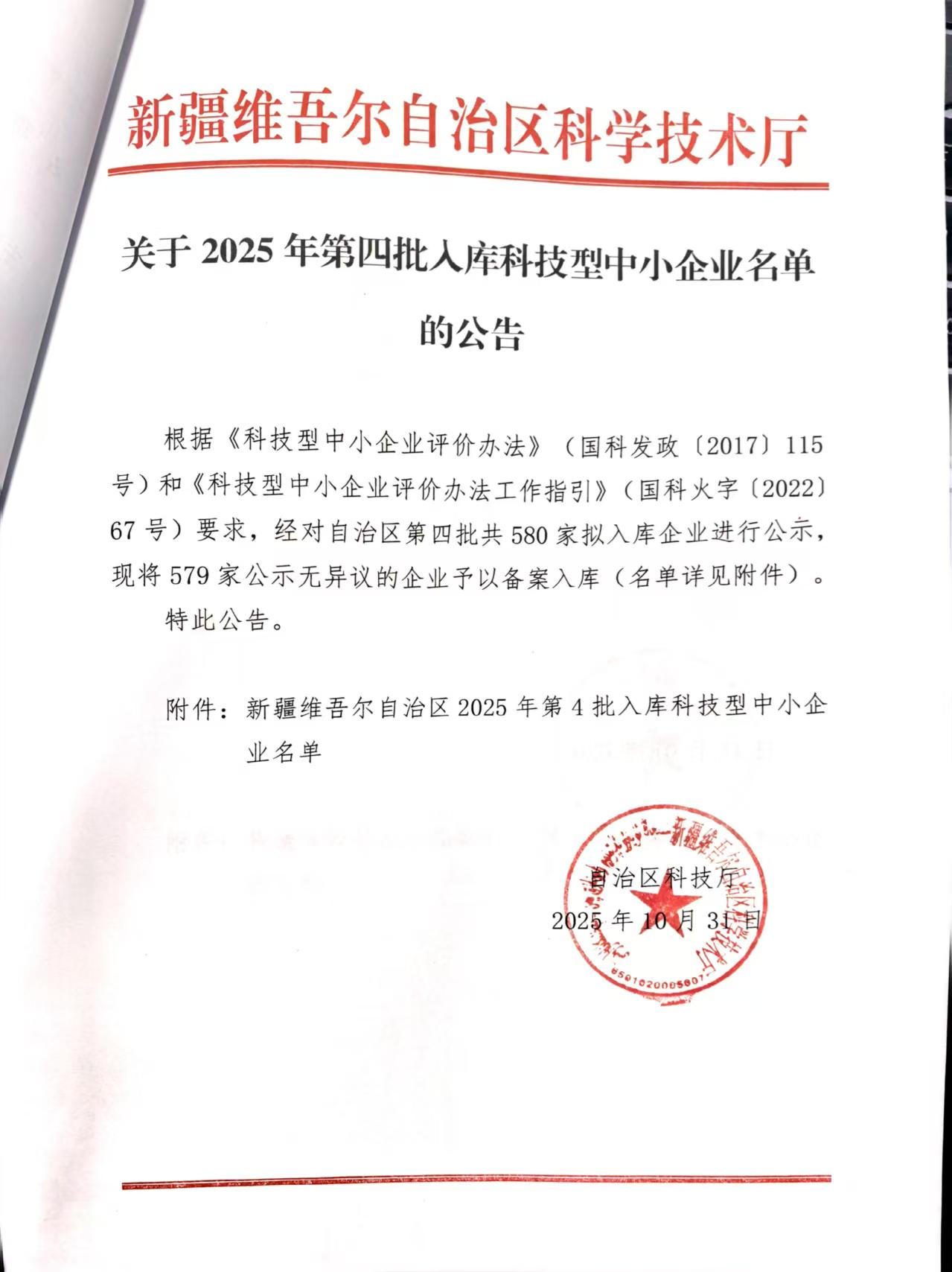 新疆維吾爾自治區(qū)2025年第4批入庫科技型中小企業(yè)名單公告