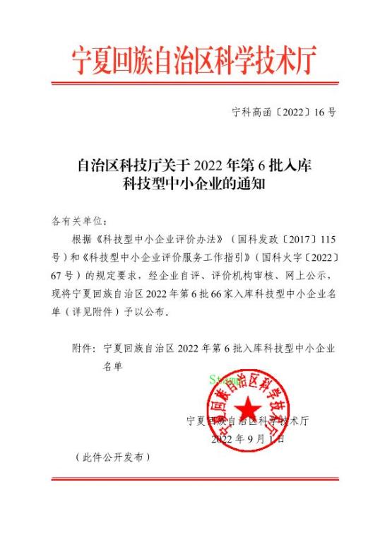 寧夏回族自治區(qū)2022年第6批入庫科技型中小企業(yè)名單公告
