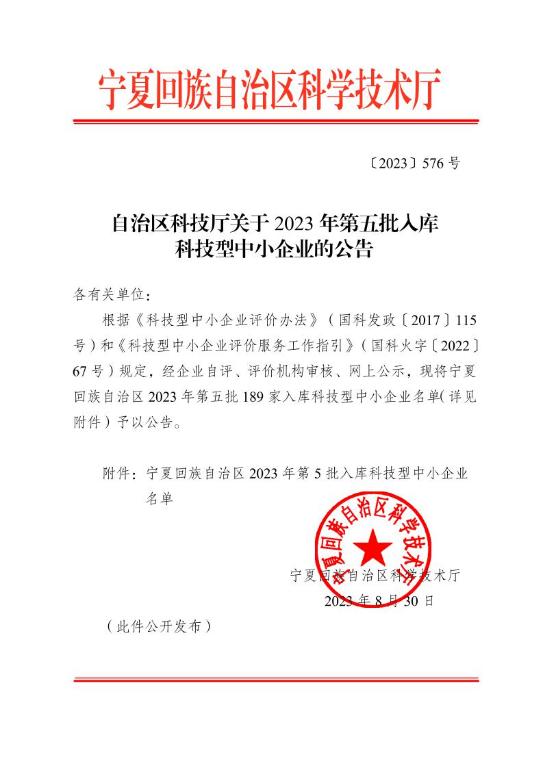 寧夏回族自治區(qū)2023年第5批入庫科技型中小企業(yè)名單公告