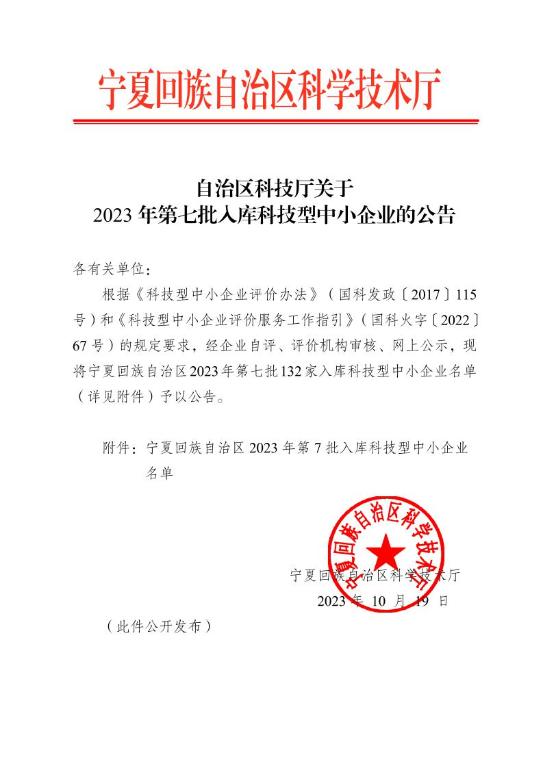 寧夏回族自治區(qū)2023年第7批入庫科技型中小企業(yè)名單公告