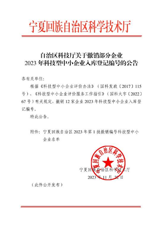寧夏回族自治區(qū)2023年第1批撤銷編號(hào)科技型中小企業(yè)名單公告