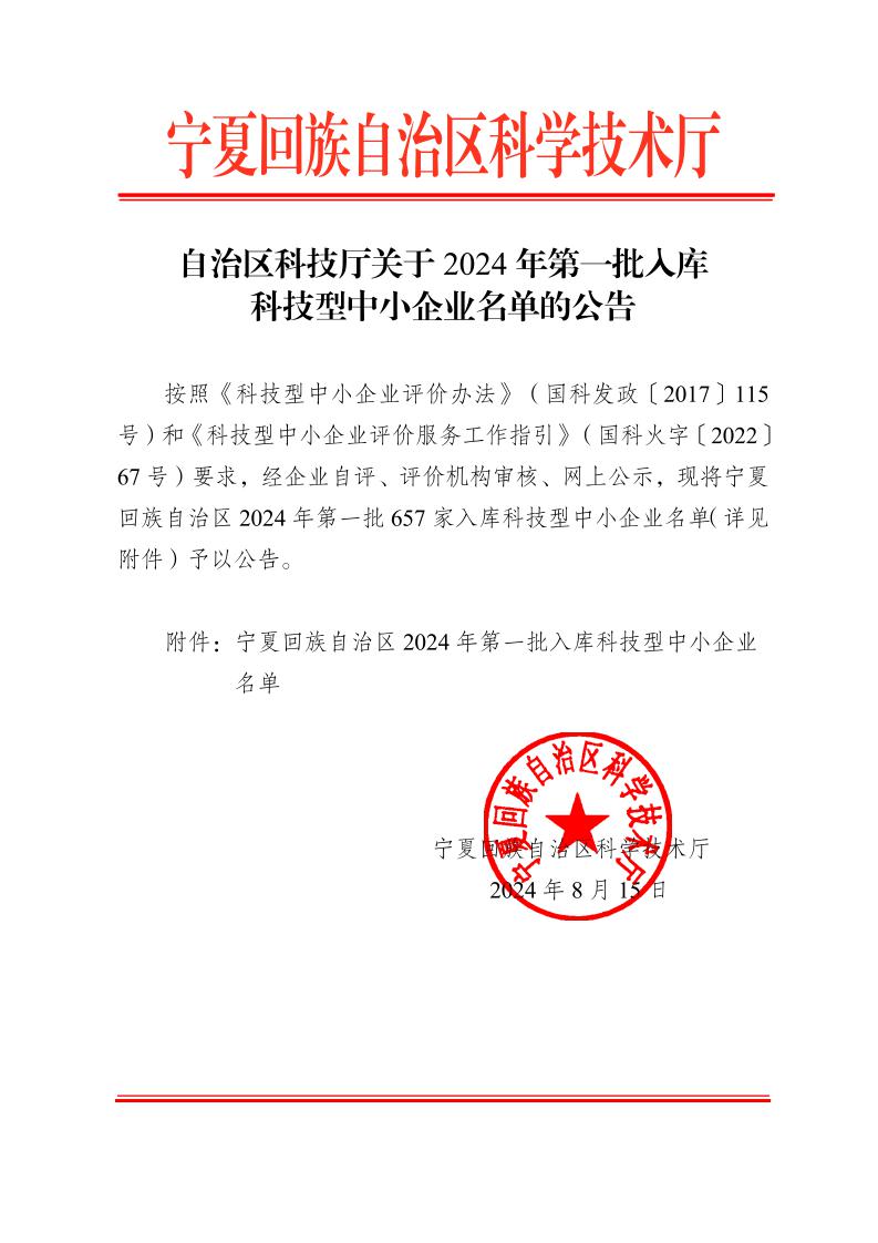 寧夏回族自治區(qū)2024年第1批入庫科技型中小企業(yè)名單公告