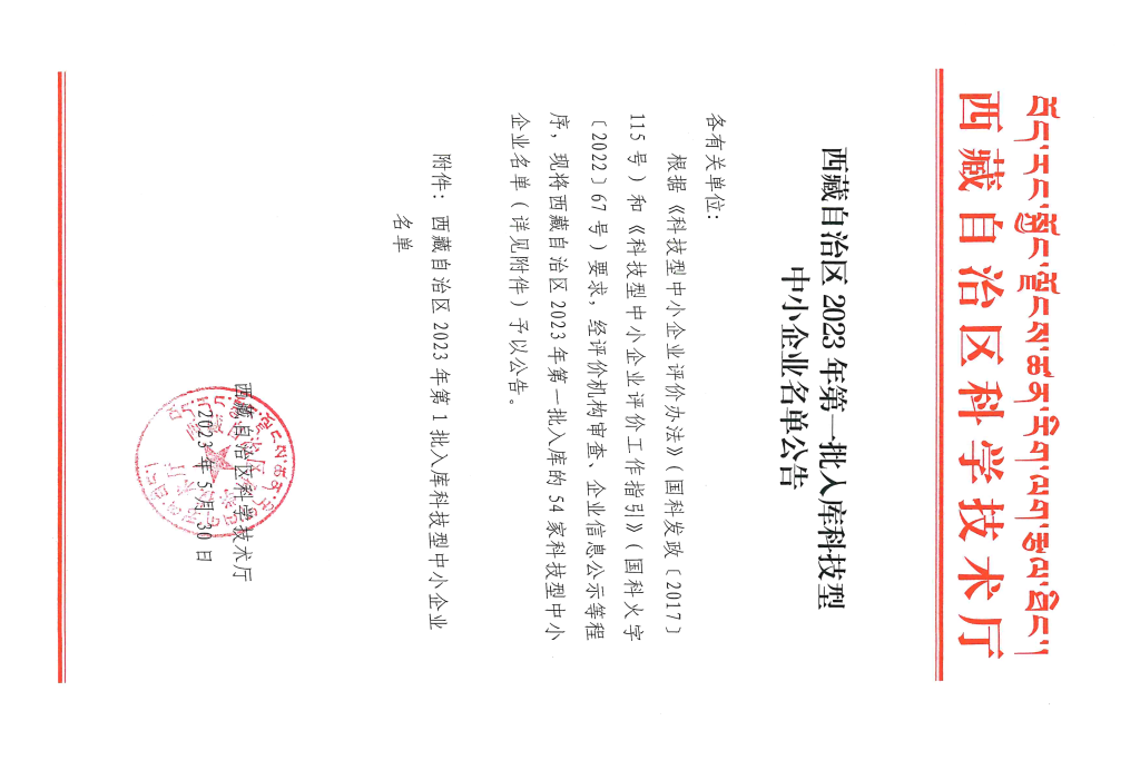 西藏自治區(qū)2023年第1批入庫科技型中小企業(yè)名單公告